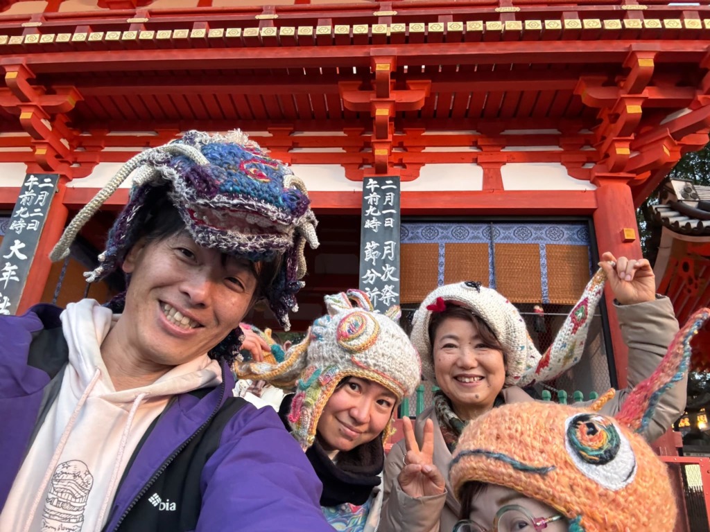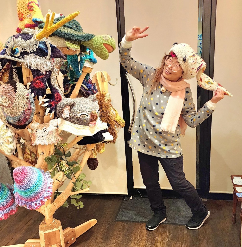 ミズホドリの絵をもとに、えっちゃんが作った編み帽子をかぶる。