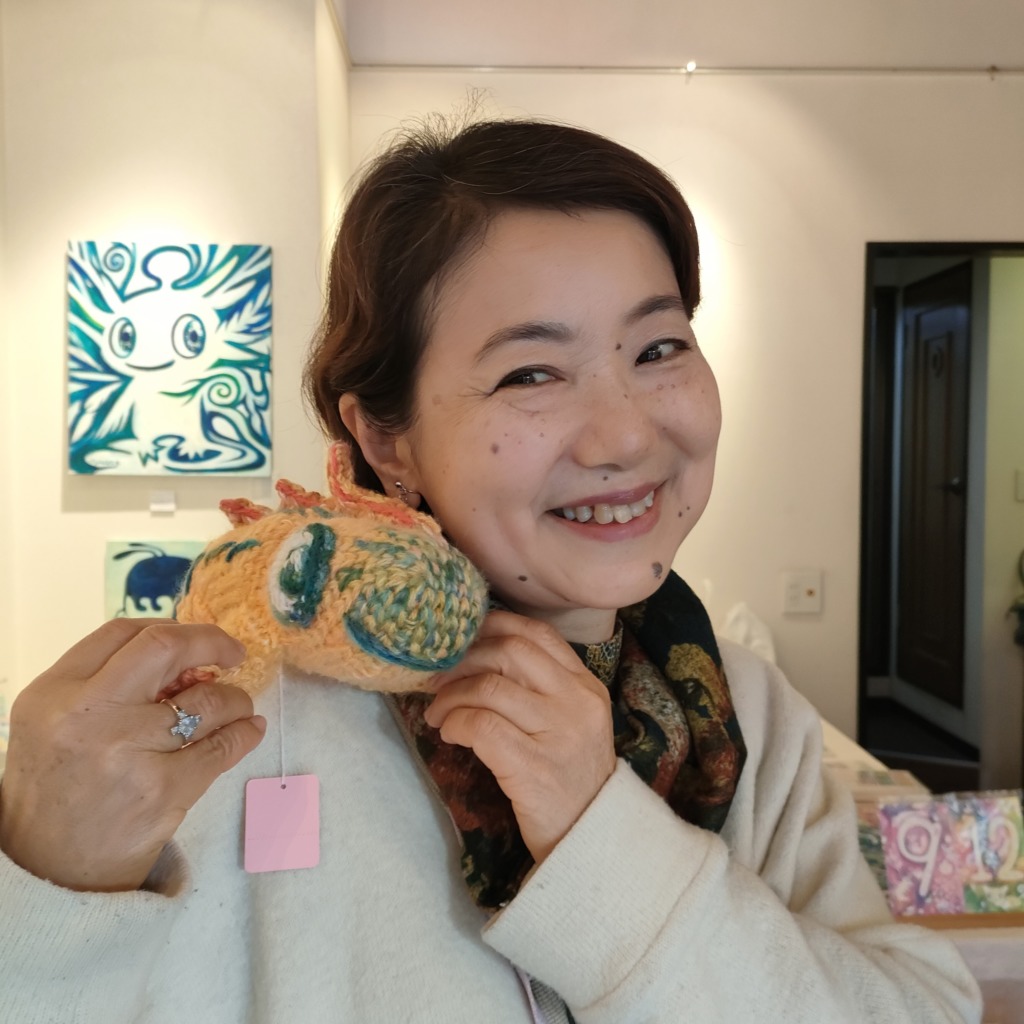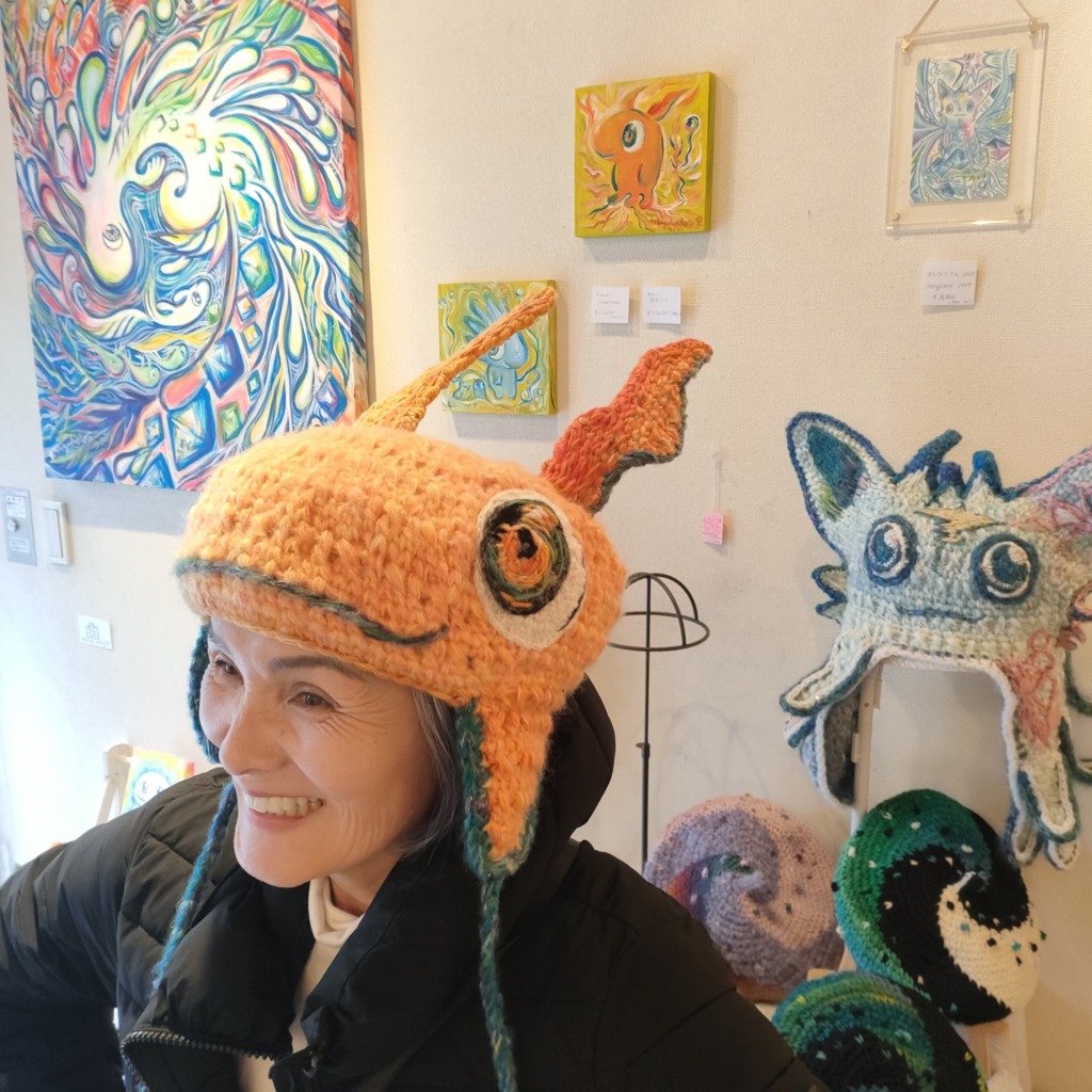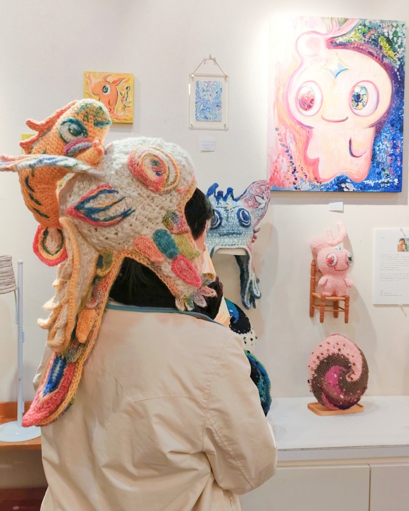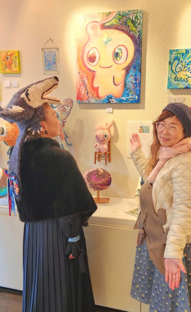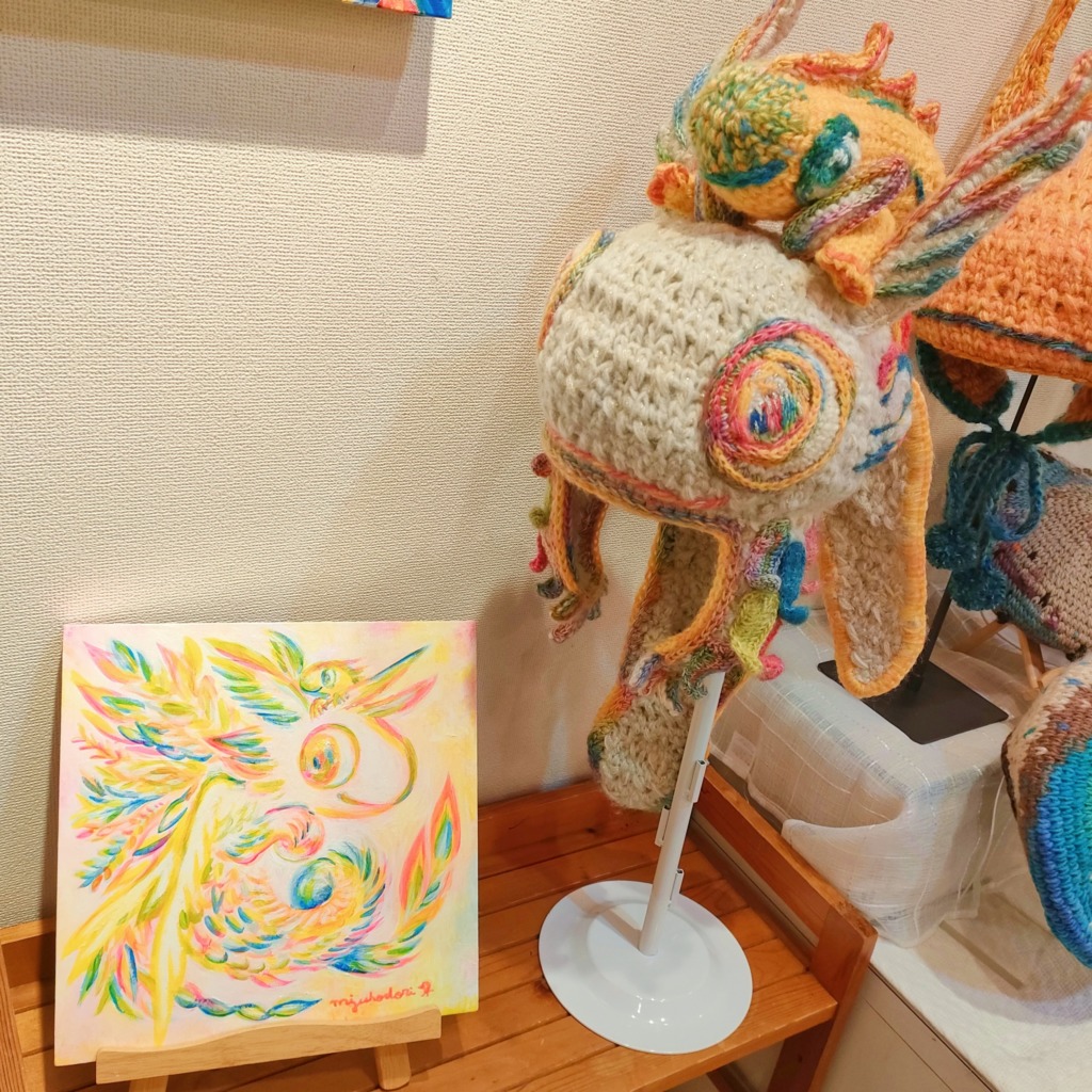ミズホドリ(私)の絵画作品 × まるまる悦(えっちゃん)の編み編み作品